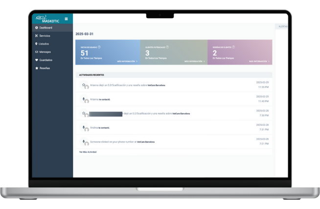 Apenas publiques tu negocio en Maskotic, podrás saber cuantos usuarios han visitado tu perfil, cuantas reseñas has recibido y muchos más datos útiles.